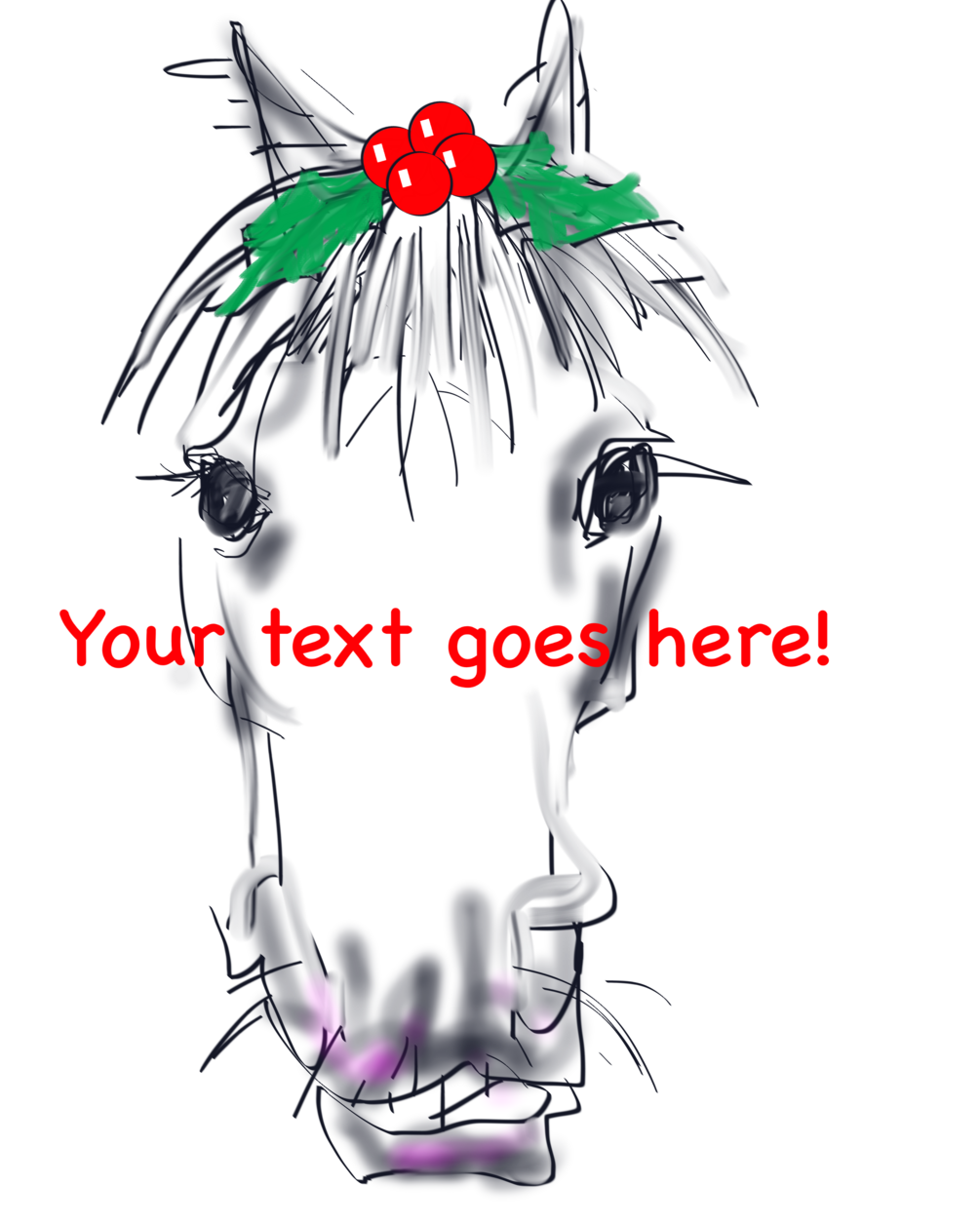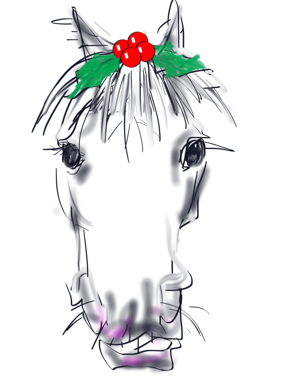 A sweet winter pony sketched in soft lines, wearing a sprig of bright holly in his fluffy forelock. The glossy leaves and red berries add a festive pop of color, capturing cozy holiday charm in a simple, heartfelt artwork—perfect for seasonal décor, prints, or digital downloads.